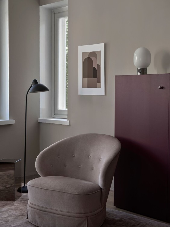 Cabinet painted with M425 Beetroot brings a subdued contrast to the space.
