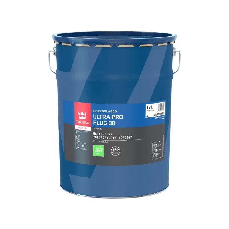 • Represents the highest possible quality on the market. Its durability and weather resistance are in a class of its own. The paint remarkably extends the service life of exterior claddings. • Provides outstanding protection against water penetration and prevents cracking of timber by also inhibiting water uptake through edges. The paint can be used both for priming and topcoating. • 2 x Ultra Pro Plus 30 provides excellent protection against water penetration, and thus suppresses cracking of timber by preventing water uptake also through the edges. • Environmental product declaration (EPD) in accordance with EN 15804+A2 & ISO 14025 / ISO 21930. • Suitable for fast production lines and drying in elevated temperature as well as in room temperature. • Contains alkyd for improved adhesion to bare wood. • Retards tannin staining and seepage of tannins from knots.