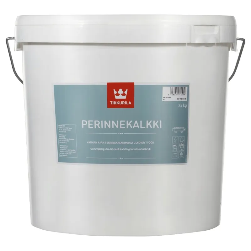 Slaked lime made of clear, kiln burnt and wet quenched limestone. Slaked lime is stored at least 20 months before packing and tinting. Tinted Perinnekalkki is a pre-tinted paint tinted with synthetic lime-resistant pigments. Tinted Perinnekalkki is made with a ratio of 40% lime putty and 60% lime water.