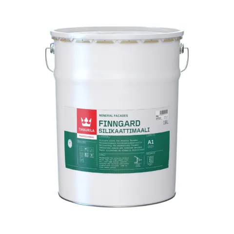 • Finngard Silikaattimaali paint for the thick plaster. Finngard Silikaattimaali is EPD verified and offers excellent water vapor permeability, making it ideal for painting technically challenging locations that are prone to damp, such as concrete, lime plaster, lime cement plaster and sand-lime brick surfaces. The product achieves the strict A1 fire-safety class.