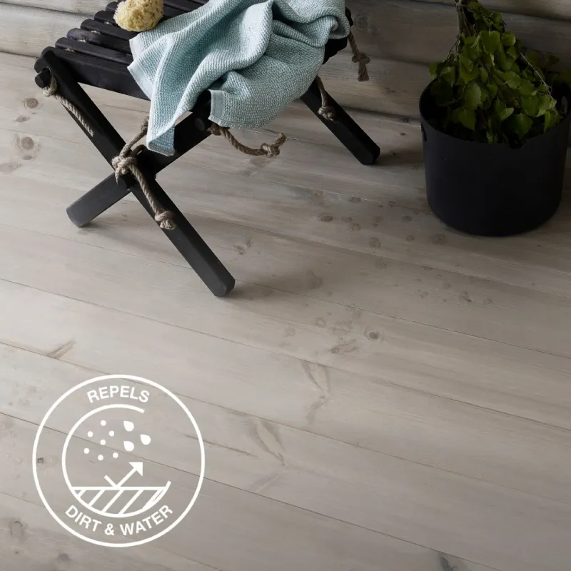 The wood oil provides a dirt- and water-repellent surface for the floors in sauna and other humid rooms.