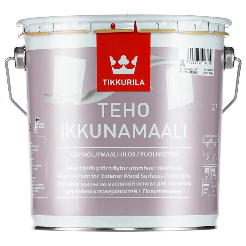 Teho Ikkunamaali (Window Paint) is a solvent-borne alkyd oil paint for traditional painting. The coat is highly resistant to weather variations and the blows and dents from use.